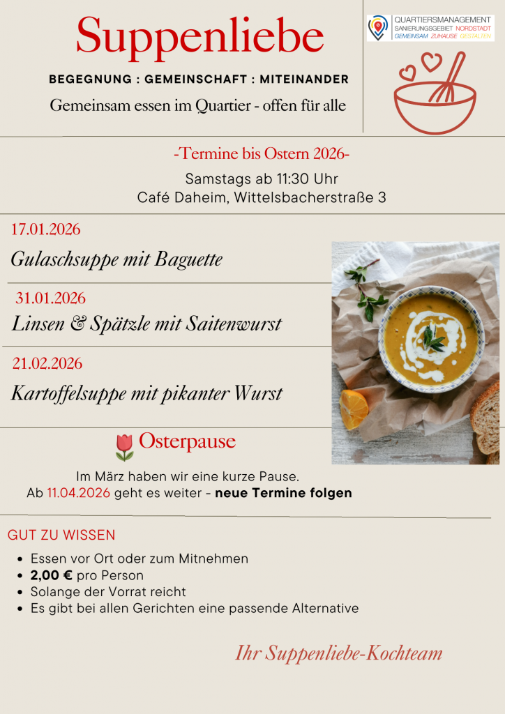 - 11:00-13:00 Uhr: Suppenliebe mit Café und Kuchen